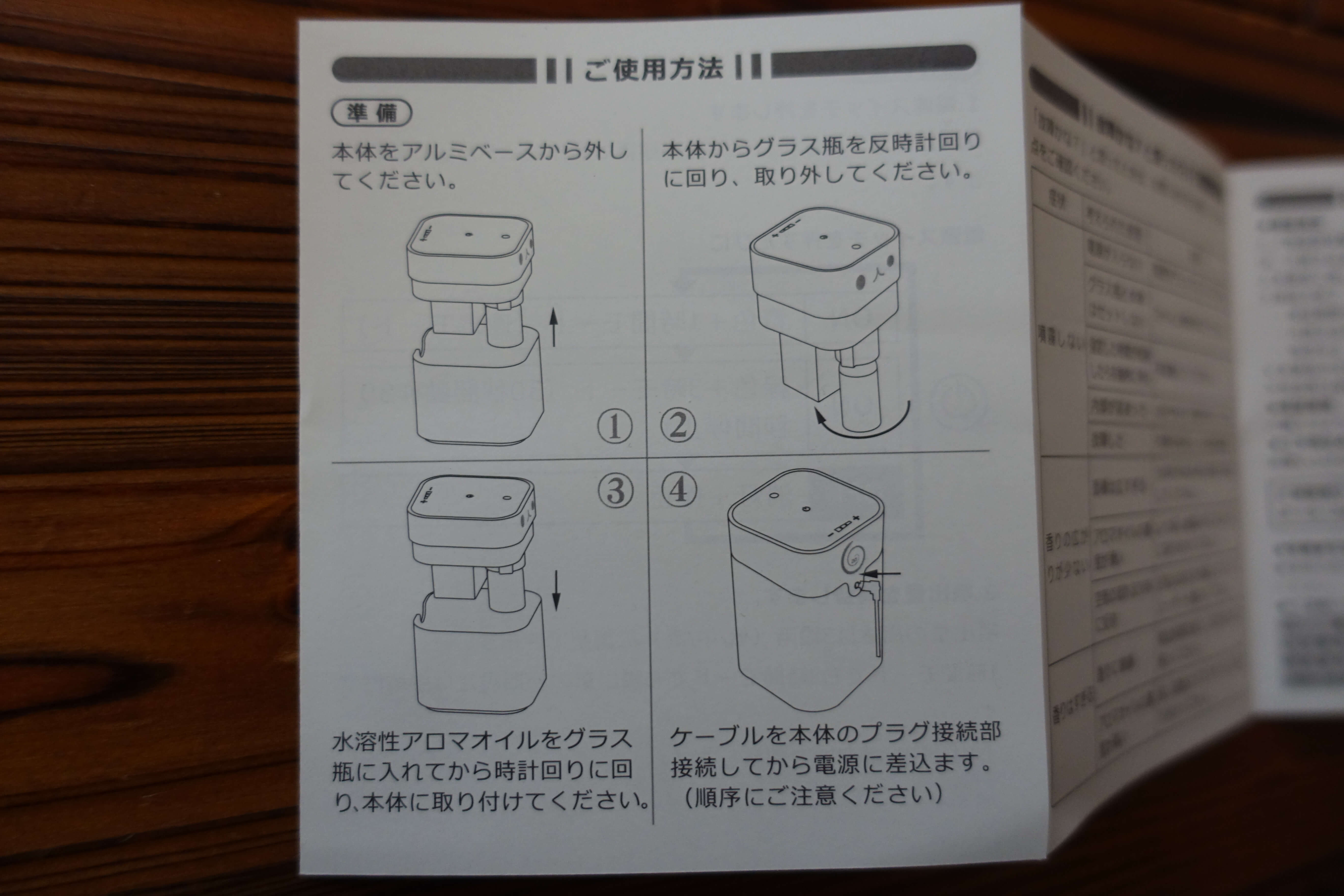 精油瓶は1つは初めから本体に取り付けられた状態なので、1つしか入ってなかった!とならないようによく確認しましょう。