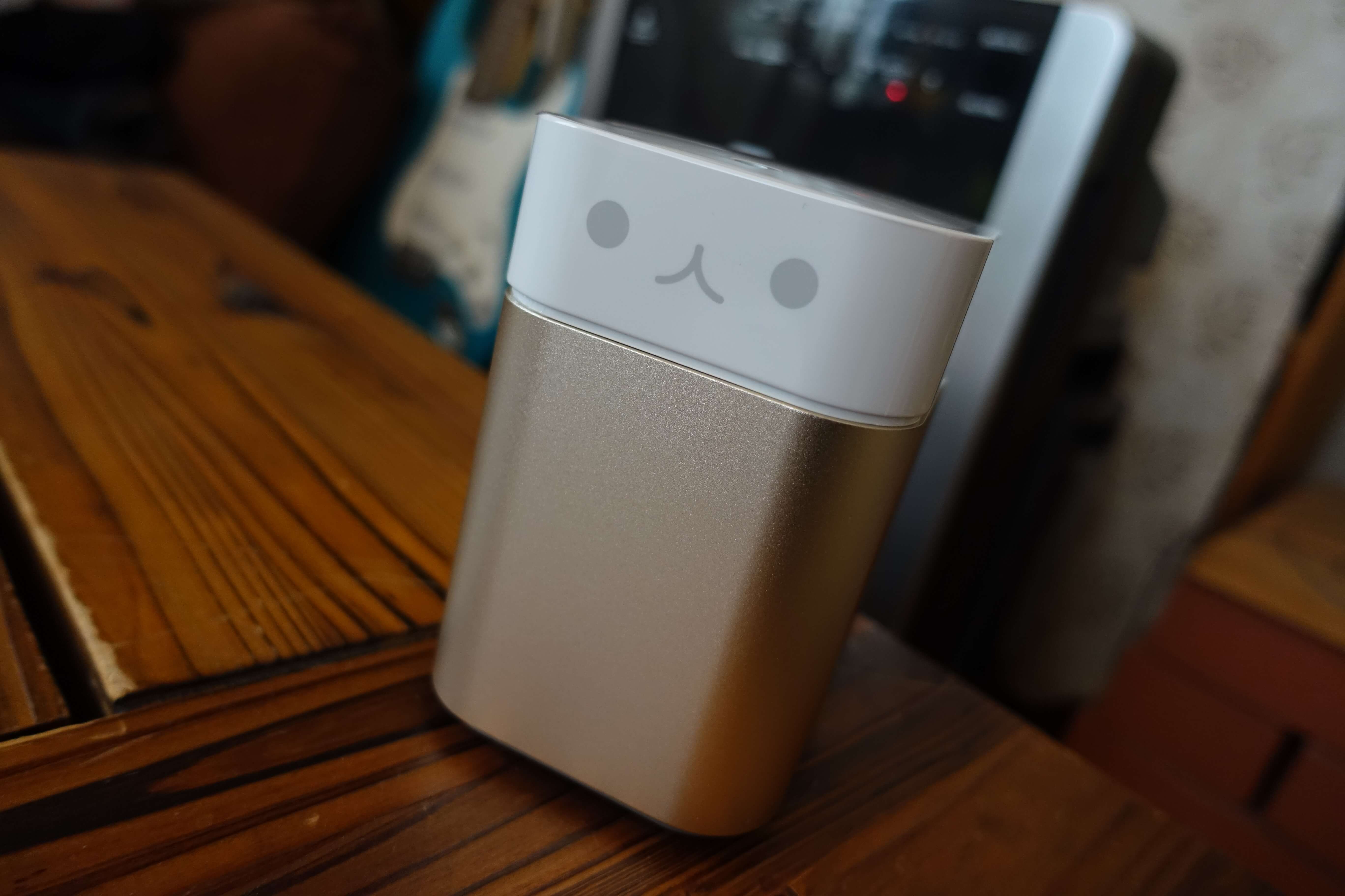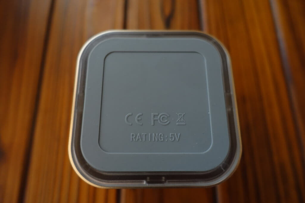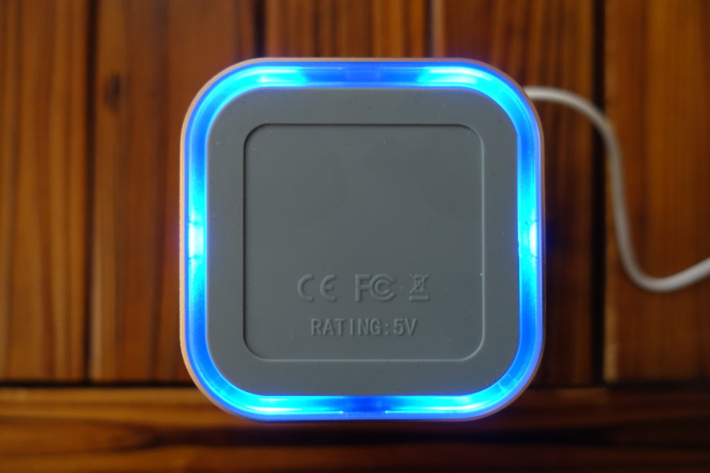 本体下部はアルミニウムでできており、適度な重量もあり安っぽさを感じない作りとなっています。本体背面に給電用の電源ソケットがあり、差し込むと本体下部が青色に発光します。